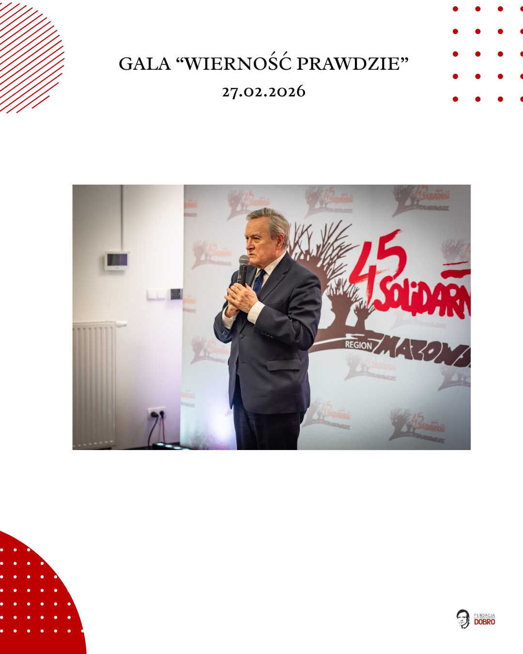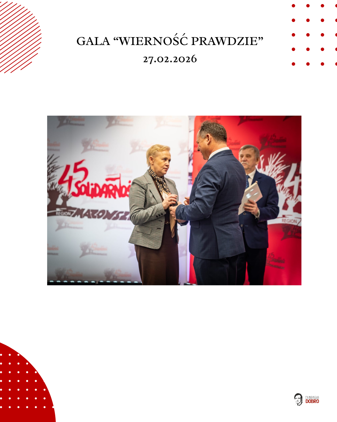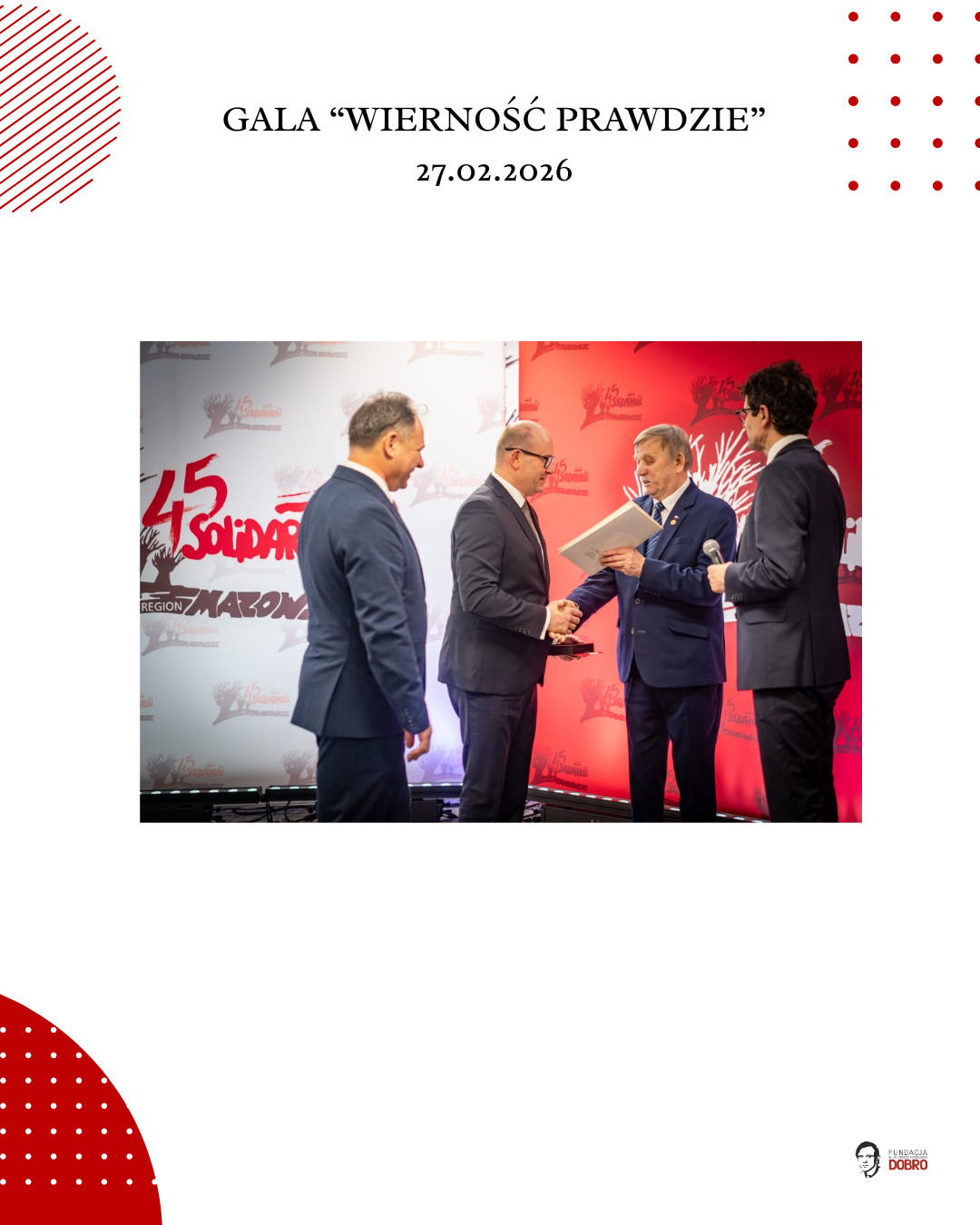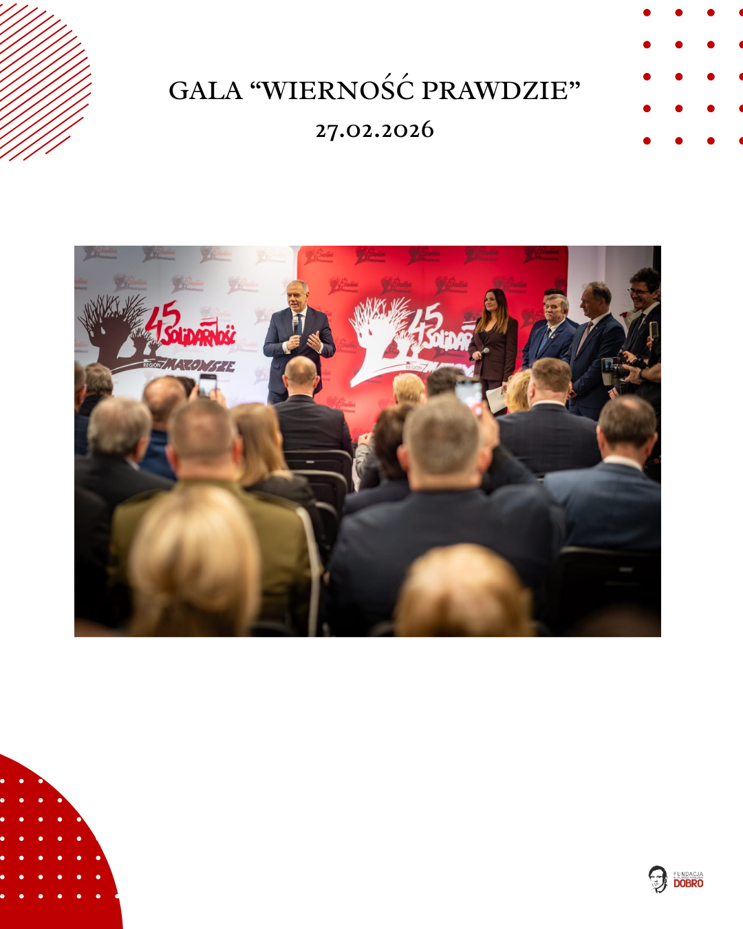 27 lutego 2026 roku w siedzibie NSZZ Solidarność Region Mazowsze w Warszawie odbyła się gala „Wierność Prawdzie”, zorganizowana przez Fundację im. Ks. Jerzego Popiełuszko „Dobro” wspólnie z Regionem Mazowsze NSZZ „Solidarność”.
