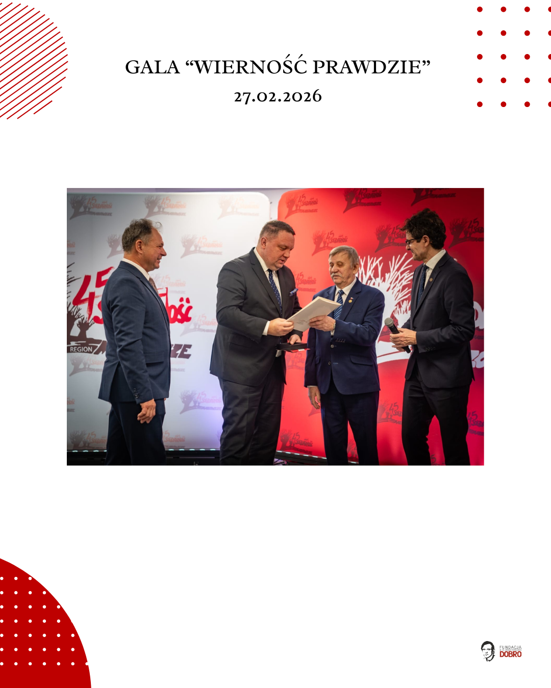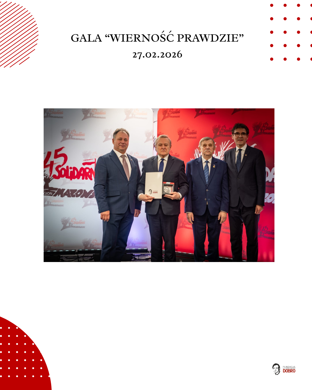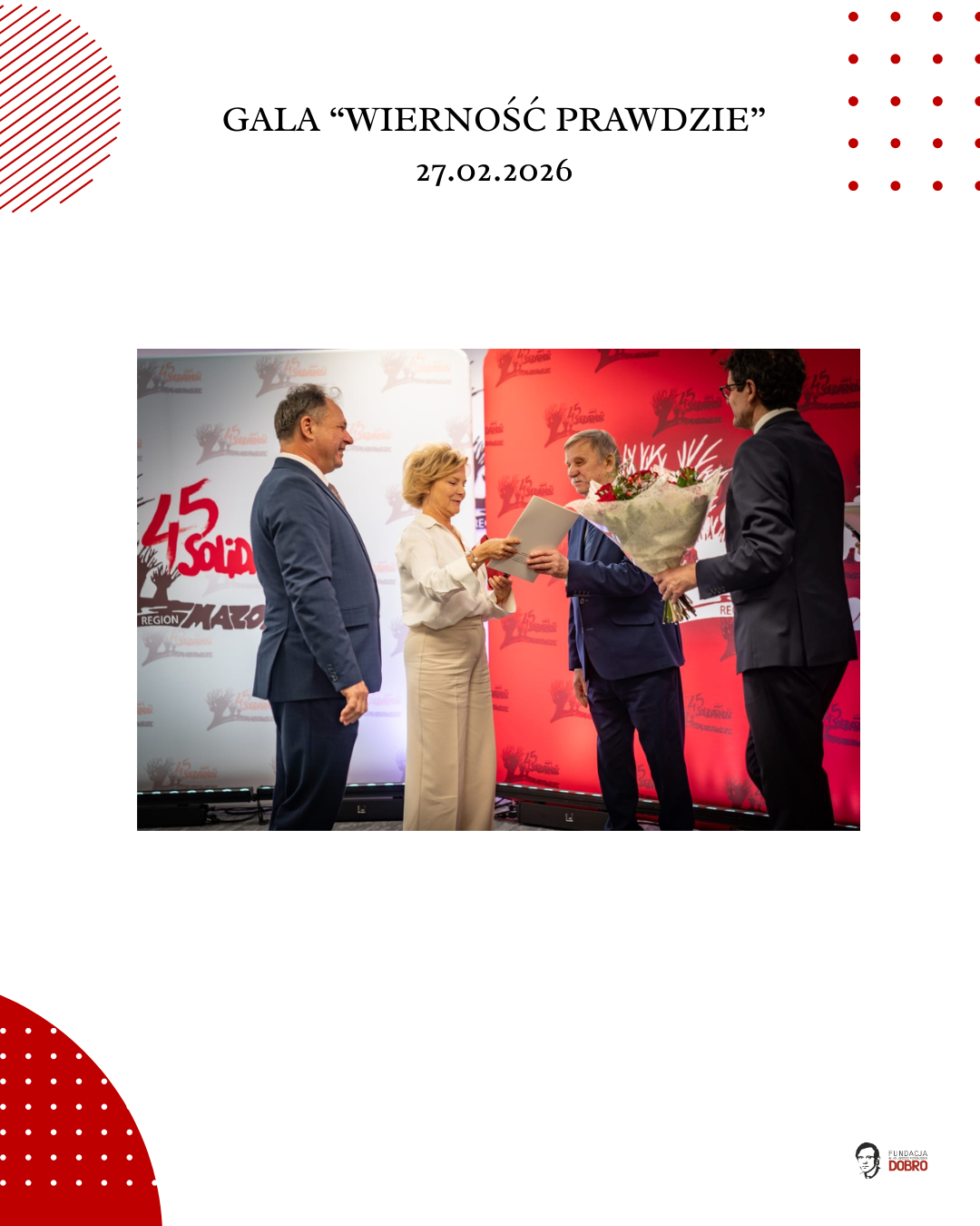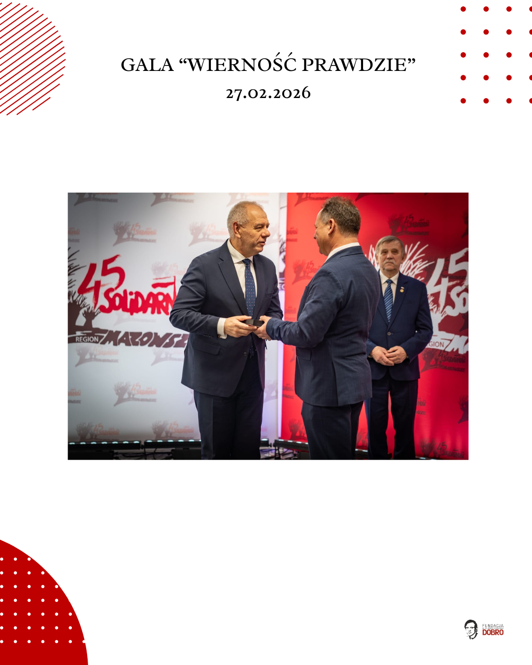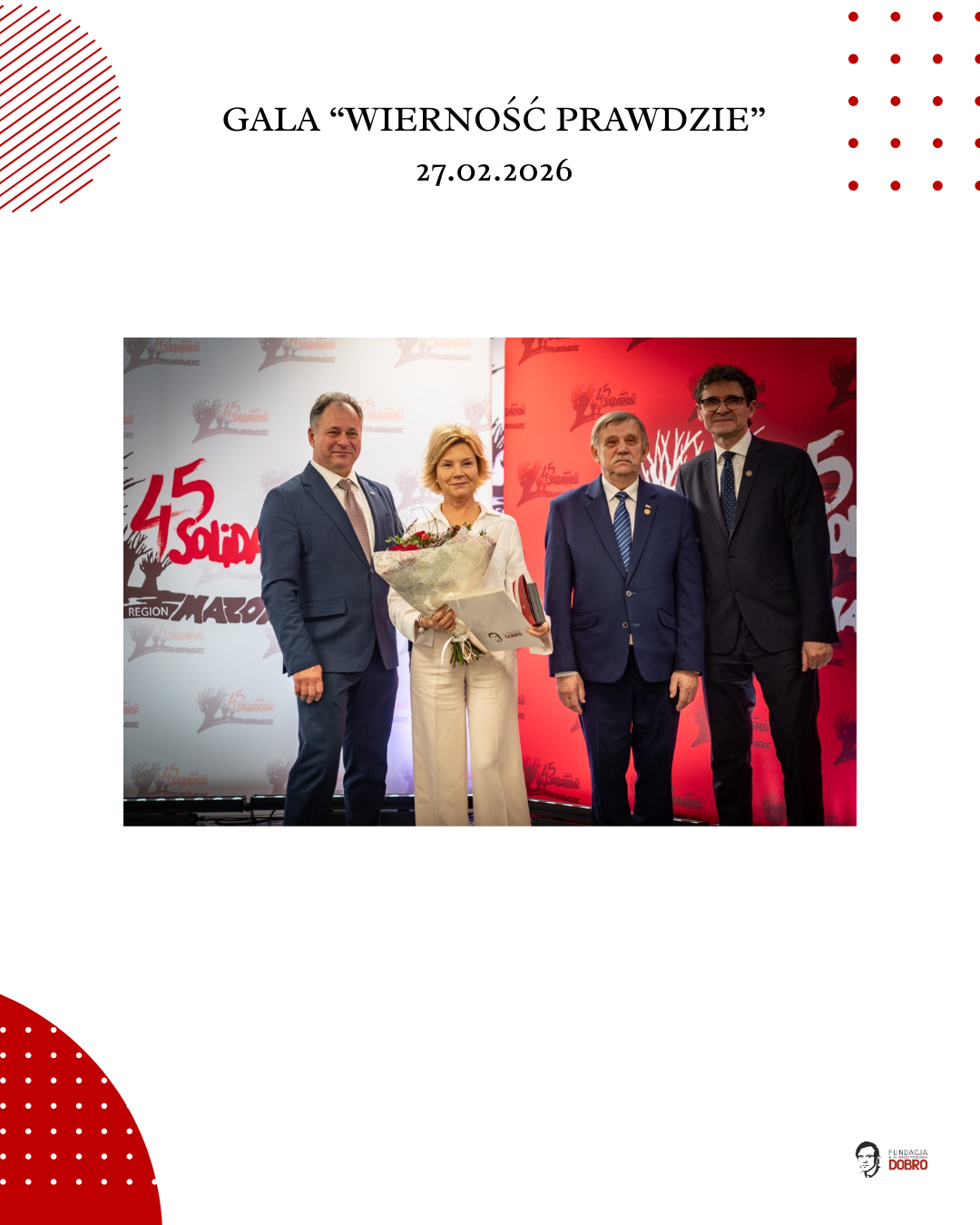 27 lutego 2026 roku w siedzibie NSZZ Solidarność Region Mazowsze w Warszawie odbyła się gala „Wierność Prawdzie”, zorganizowana przez Fundację im. Ks. Jerzego Popiełuszko „Dobro” wspólnie z Regionem Mazowsze NSZZ „Solidarność”.