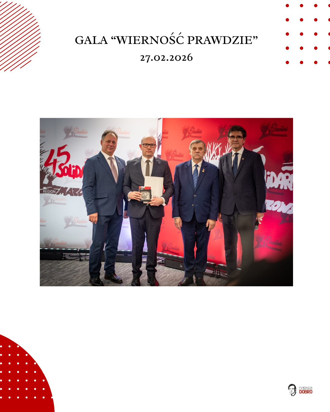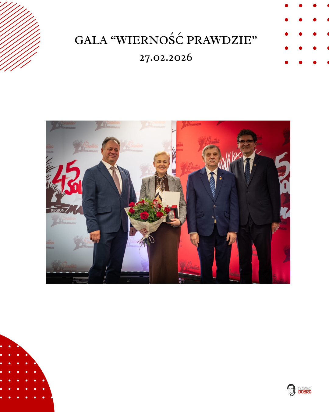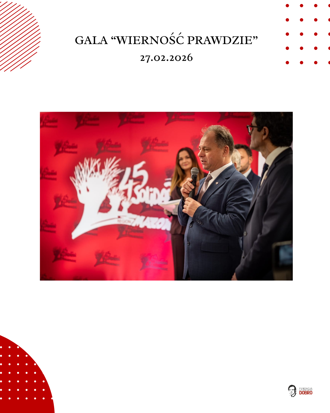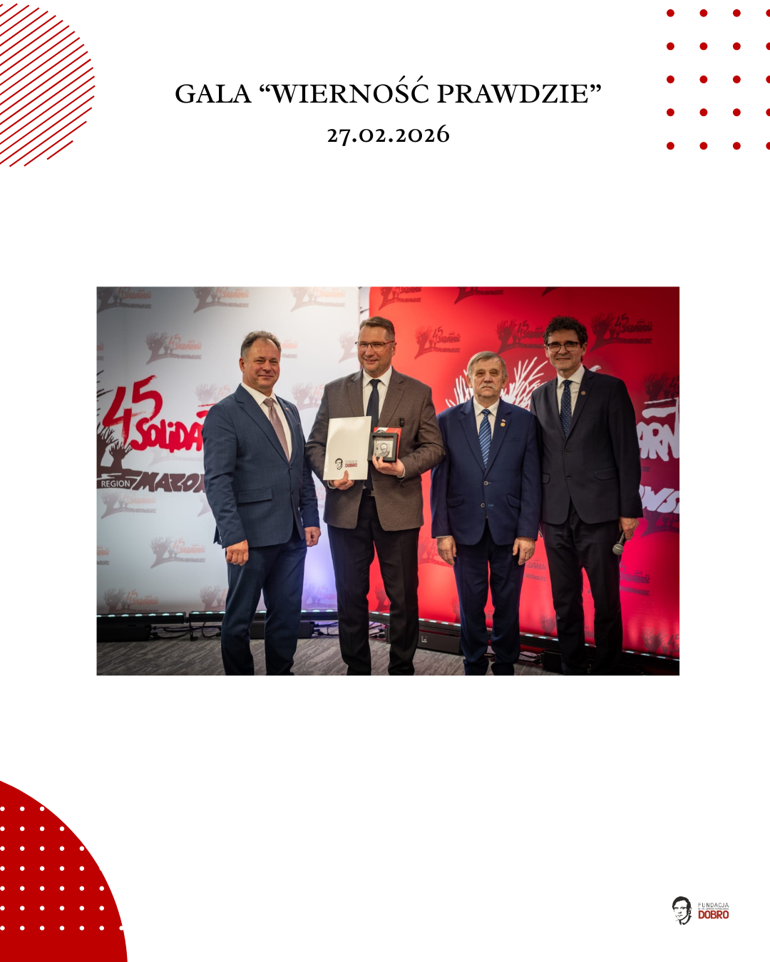 27 lutego 2026 roku w siedzibie NSZZ Solidarność Region Mazowsze w Warszawie odbyła się gala „Wierność Prawdzie”, zorganizowana przez Fundację im. Ks. Jerzego Popiełuszko „Dobro” wspólnie z Regionem Mazowsze NSZZ „Solidarność”.