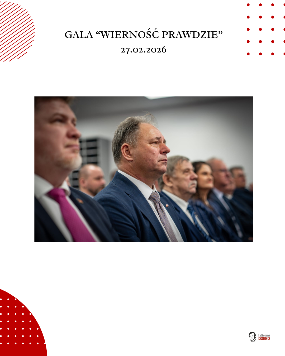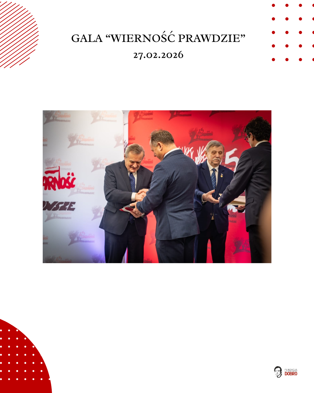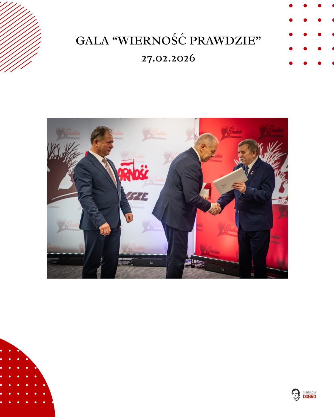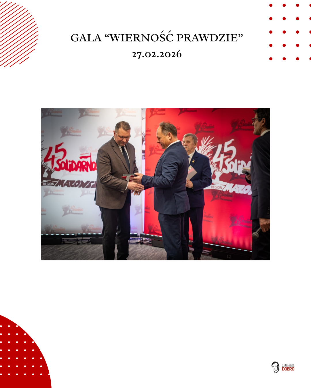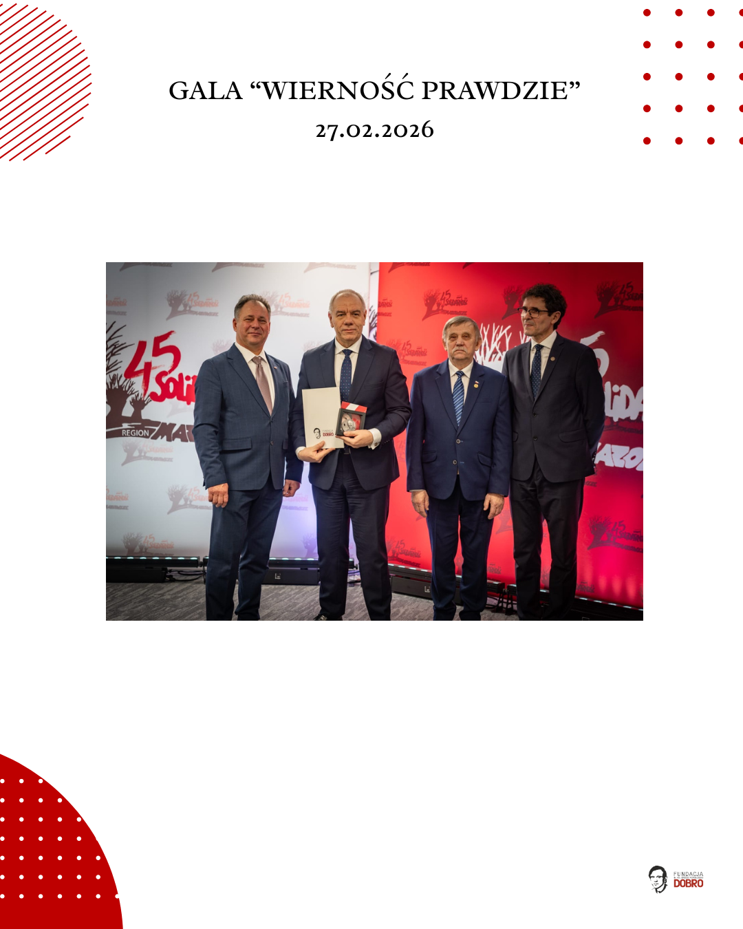 27 lutego 2026 roku w siedzibie NSZZ Solidarność Region Mazowsze w Warszawie odbyła się gala „Wierność Prawdzie”, zorganizowana przez Fundację im. Ks. Jerzego Popiełuszko „Dobro” wspólnie z Regionem Mazowsze NSZZ „Solidarność”.