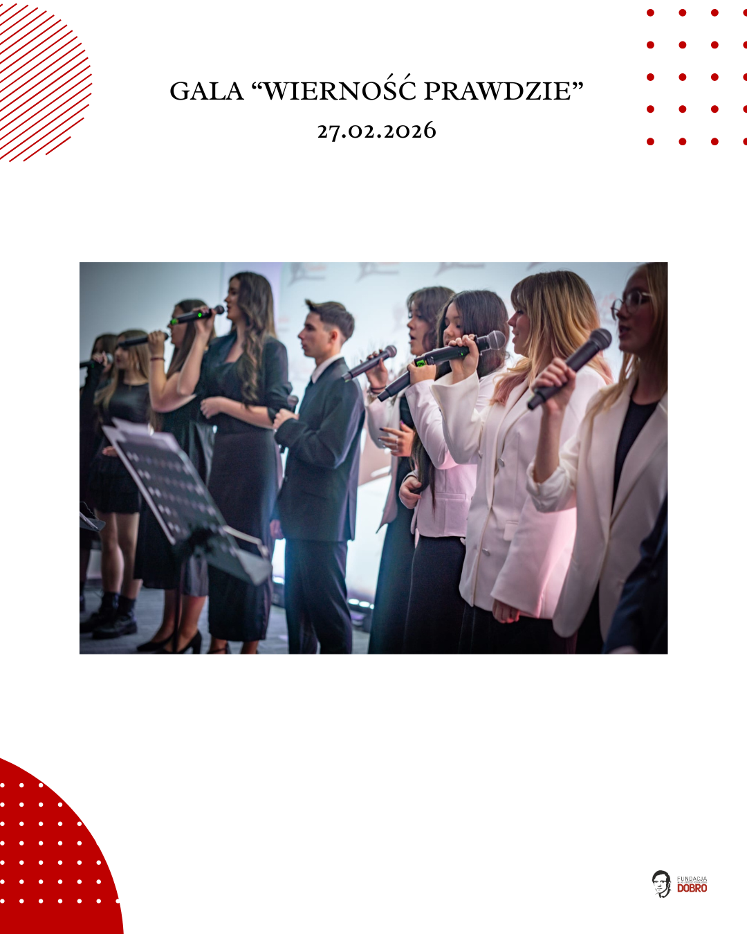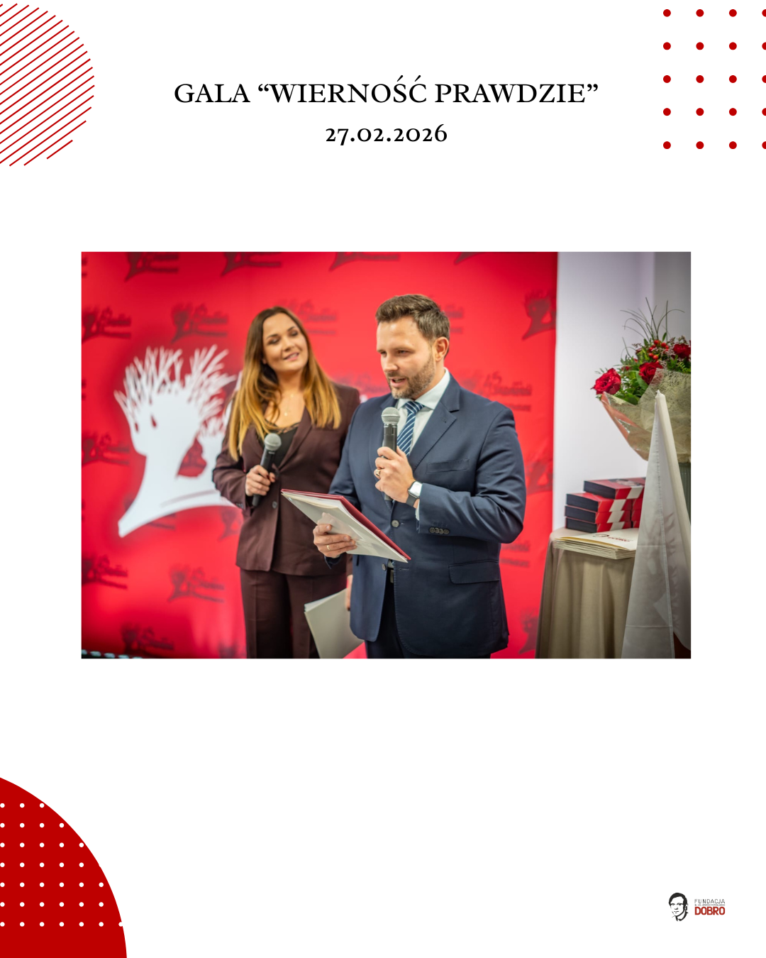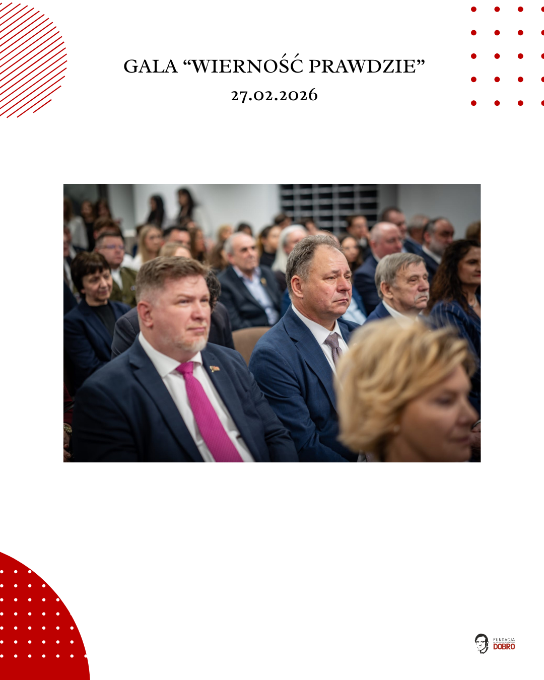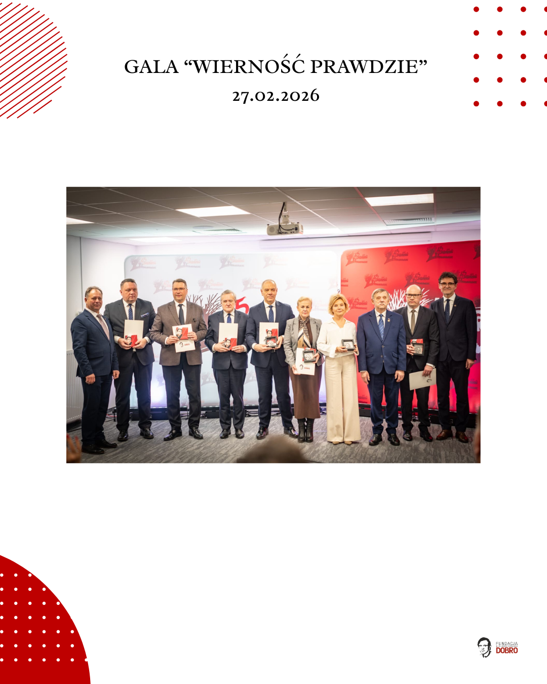 27 lutego 2026 roku w siedzibie NSZZ Solidarność Region Mazowsze w Warszawie odbyła się gala „Wierność Prawdzie”, zorganizowana przez Fundację im. Ks. Jerzego Popiełuszko „Dobro” wspólnie z Regionem Mazowsze NSZZ „Solidarność”.