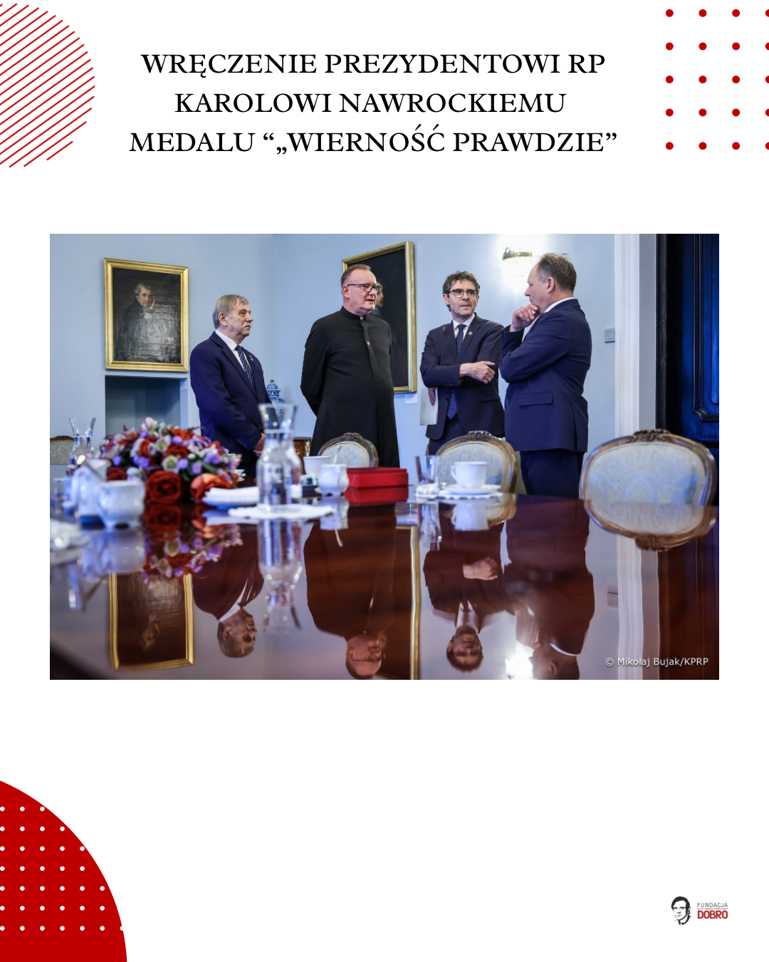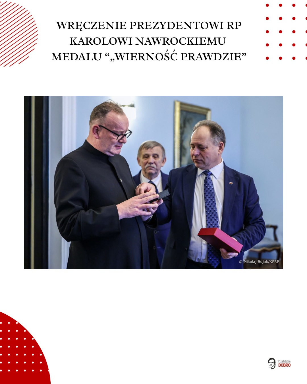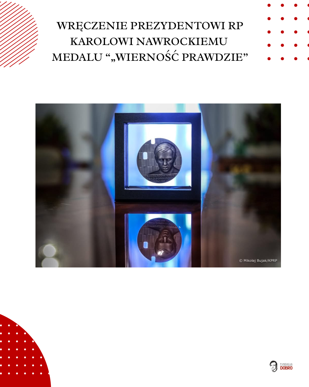 4 marca Prezydent Karol Nawrocki otrzymał medal „Wierność Prawdzie”, przyznawany przez naszą fundację im. Ks. Jerzego Popiełuszko „Dobro”.